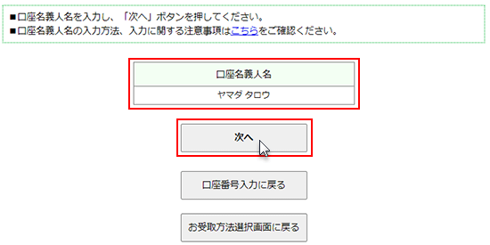 口座名義人(カナ)を入力し、「次へ」をクリックします。