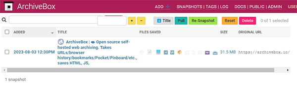 「ArchiveBox」から「SNAPSHOTS」をクリックするとアーカイブ一覧の一番左にチェックボックスが表示されます。