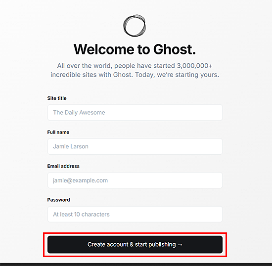 Webブラウザから「https://[設定したドメイン]/ghost/」にアクセスするとアカウント設定画面が表示されるので、情報を入力して「Create account & start publishing →」をクリックします。