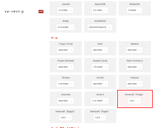 「イメージタイプ」における「アプリケーション」タブより「Minecraft(Forge)」をクリックしてください。