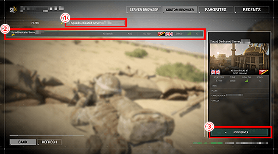 「2-2.Squadサーバー情報の確認」にて確認した「Squadサーバーの表示名」を上部の検索窓に入力してください。