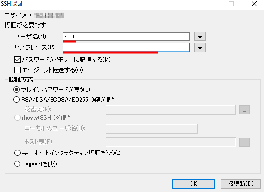 「ユーザー名(N)」に「root」、「パスフレーズ(P)」にアプリイメージインストール時に設定したパスフレーズを入力してください。