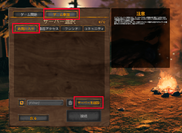 「ゲーム参加」タブを選択し、「お気に入り」を選択した状態で「サーバーを追加」をクリックしてください。