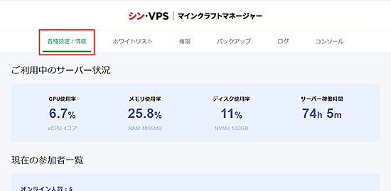 マインクラフトマネージャーへログインし、「各種設定/情報」タブを開きます。