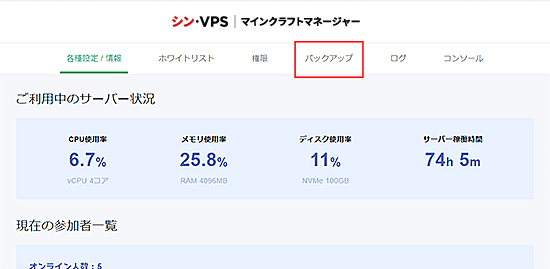 マインクラフトマネージャーへログインし、「バックアップ」タブを開きます。