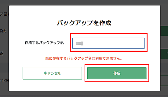 「作成するバックアップ名」に任意の名前を入力後、「作成」ボタンをクリックするとバックアップが作成されます。