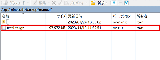 「/opt/minecraft/backup/manual」ディレクトリに「#バックアップ名#.tar.gz」形式で保存されています。