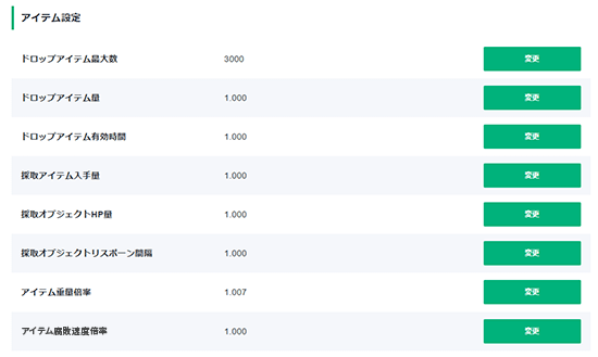 | 採取オブジェクトリスポーン間隔 | 採取オブジェクトリスポーン間隔を変更することが可能です。 |